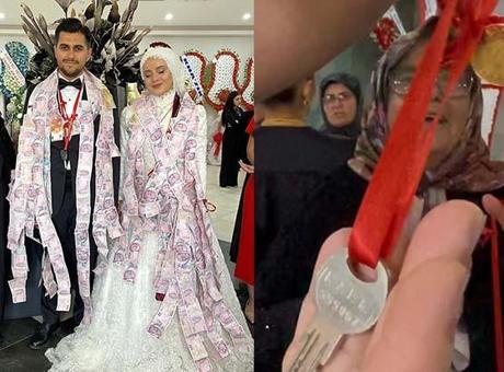 Ev ve araç anahtarını babaanne Emine Arslan ile birlikte Hüseyin Arslan'a takan damadın kuzeni Fuat Sönmez, "Damadın babaannesi Emine Arslan'dan merkezde bir adet daire ve son model bir otomobil, tapusu yanımızda yok ama bir adette İncekum'da arsa, bir tane torunu zaten" diyerek taktı.