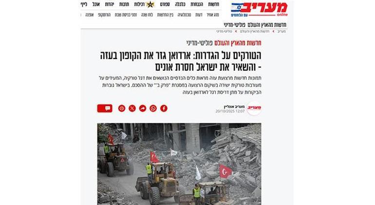 İsrail basınından Maariv, iş makinelerinin Gazze topraklarında aktif biçimde çalıştığını ve Türkiye’nin hem diplomatik hem de ekonomik anlamda sürece ilk avantajını sağladığını aktardı. Haberde, Ankara’nın sahada hızlı hareket etmesinin, bölgesel etkinliğini ve diplomatik gücünü gözler önüne serdiği vurgulandı.