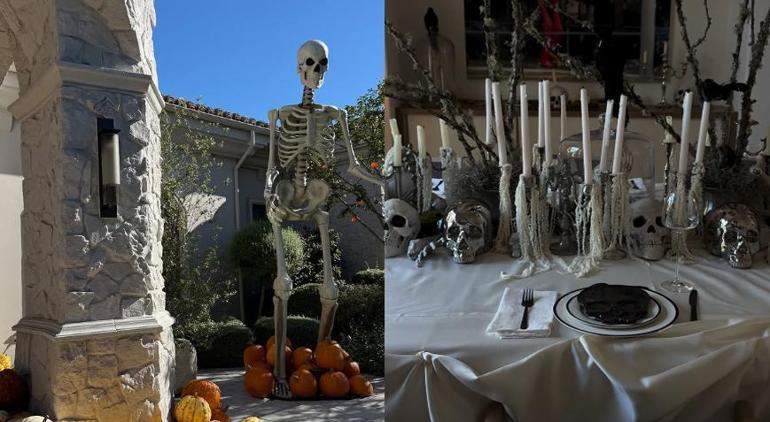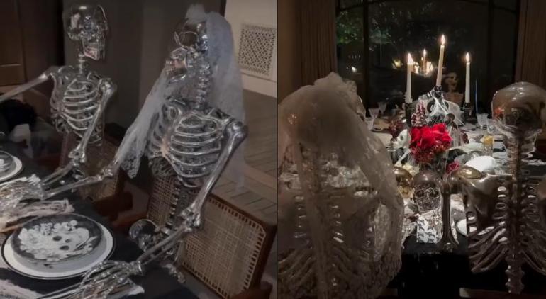 Paylaşımlarda, evinin girişinde yükselen dev bir iskelet heykeli ve etrafını çevreleyen turuncu, beyaz ve pastel tonlarda balkabakları dikkat çekti. İç mekânda ise metalik kafatasları, siyah yaprak süslemeler, uzun beyaz mumlar ve iskelet ellerinden oluşan bir masa düzeni görülüyordu.