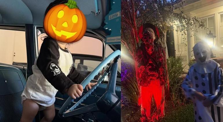 Kourtney Kardashian, ayrıca 23 aylık oğlu Rocky Thirteen’in sevimli bir fotoğrafını da “trick or treat” (şaka ya da şeker) notuyla paylaştı. Küçük Rocky, siyah-beyaz uzun kollu tişörtüyle arabada direksiyonu tutarken görülüyor, yüzü ise balkabağı emojisiyle gizlenmişti.