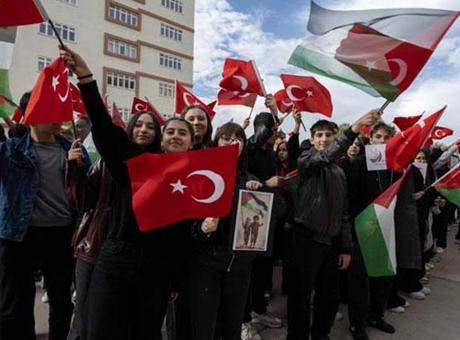 Ellerinde Filistin ve Türk bayrakları sallayan öğrenciler, hep bir ağızdan "Çocuklar ölürken sessiz kalınmaz", "Nehirden denize özgür Filistin", "Katil İsrail, Gazze'den defol" sloganları attı.