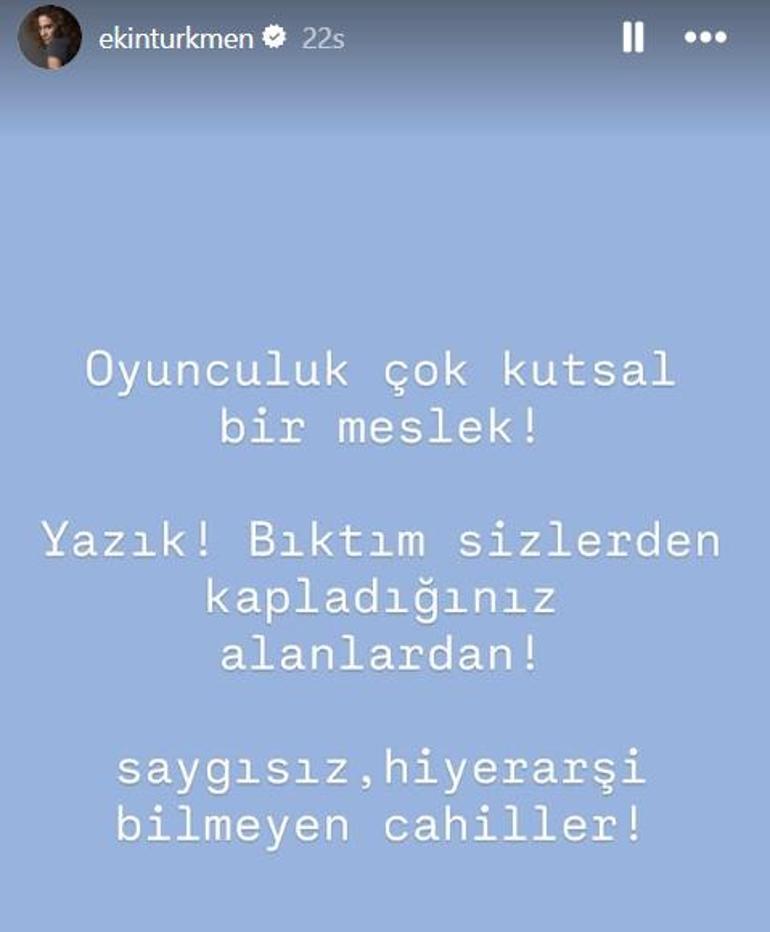 Türkmen, "Oyunculuk çok kutsal bir meslek! Yazık, bıktım sizlerden kapladığınız alanlardan! Saygısız, hiyerarşi bilmeyen cahiller' diyerek sert açıklamada bulundu.
