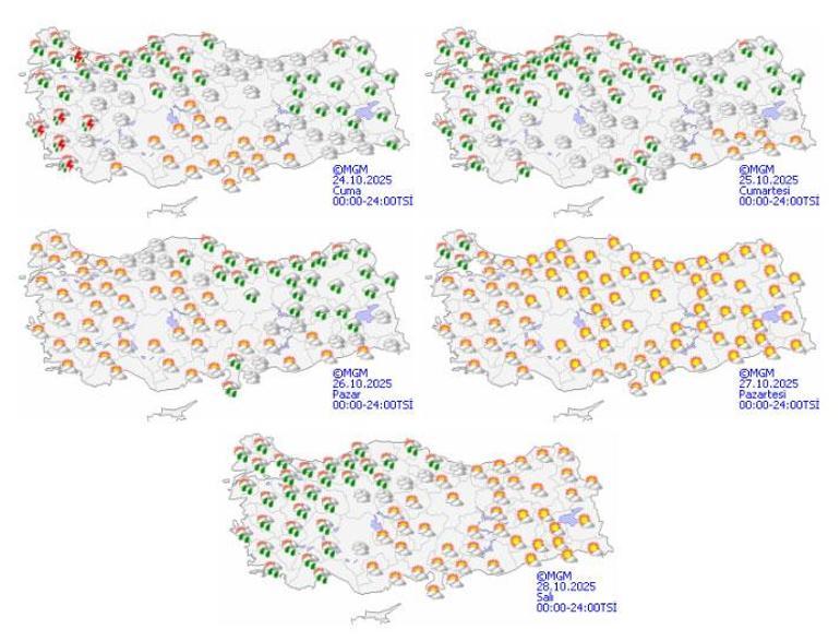 Meteoroloji Genel Müdürlüğü tarafından yapılan tahminlere göre: Ülkemiz genelinin parçalı, yer yer çok bulutlu, Marmara, Ege, Batı Akdeniz, Doğu Akdeniz’in Toroslar mevkii, Batı Karadeniz, Orta Karadeniz (Ordu hariç), Doğu Karadeniz'in iç kesimleri, Doğu Anadolu'nun kuzey ve batısı, Eskişehir, Ankara, Çankırı, Sivas, Çorum, Bitlis ve Van çevrelerinin yağmur ve sağanak, batı kesimlerin yer yer gök gürültülü sağanak, Doğu Karadeniz’in iç kesimlerinin yüksekleri ile Doğu Anadolu’nun kuzeydoğusunun yükseklerinin karla karışık yağmur ve yer yer kar yağışlı geçeceği tahmin ediliyor. Yağışların; Kuzey Ege kıyıları ile Edirne'nin ve Kırklareli’nin güneyi, Tekirdağ’ın batısı ve Çanakkale çevrelerinde yer yer kuvvetli olması bekleniyor.