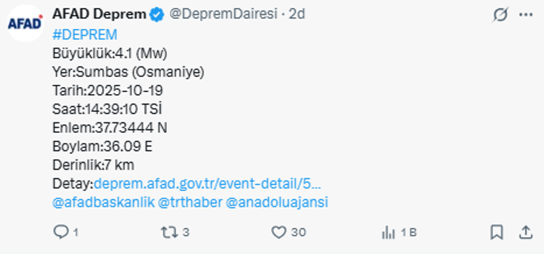 Osmaniye'nin Sumbas ilçesinde saat 14.39'da 4.1 büyüklüğünde deprem meydana geldi.