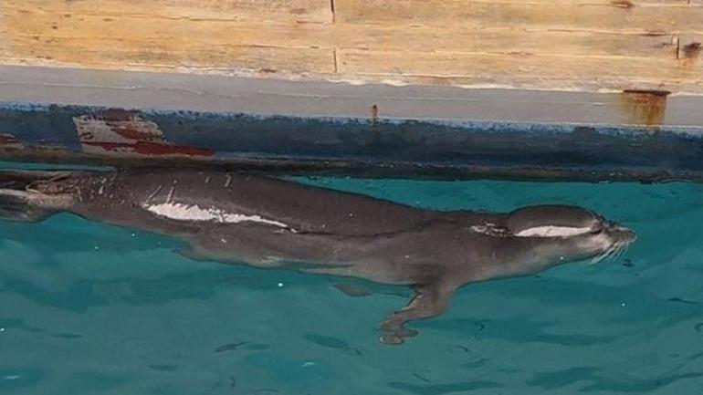 Bir süre iskelede bağlı teknelerin yanında yüzen Akdeniz fokunu denizciler kayıt altına aldı.